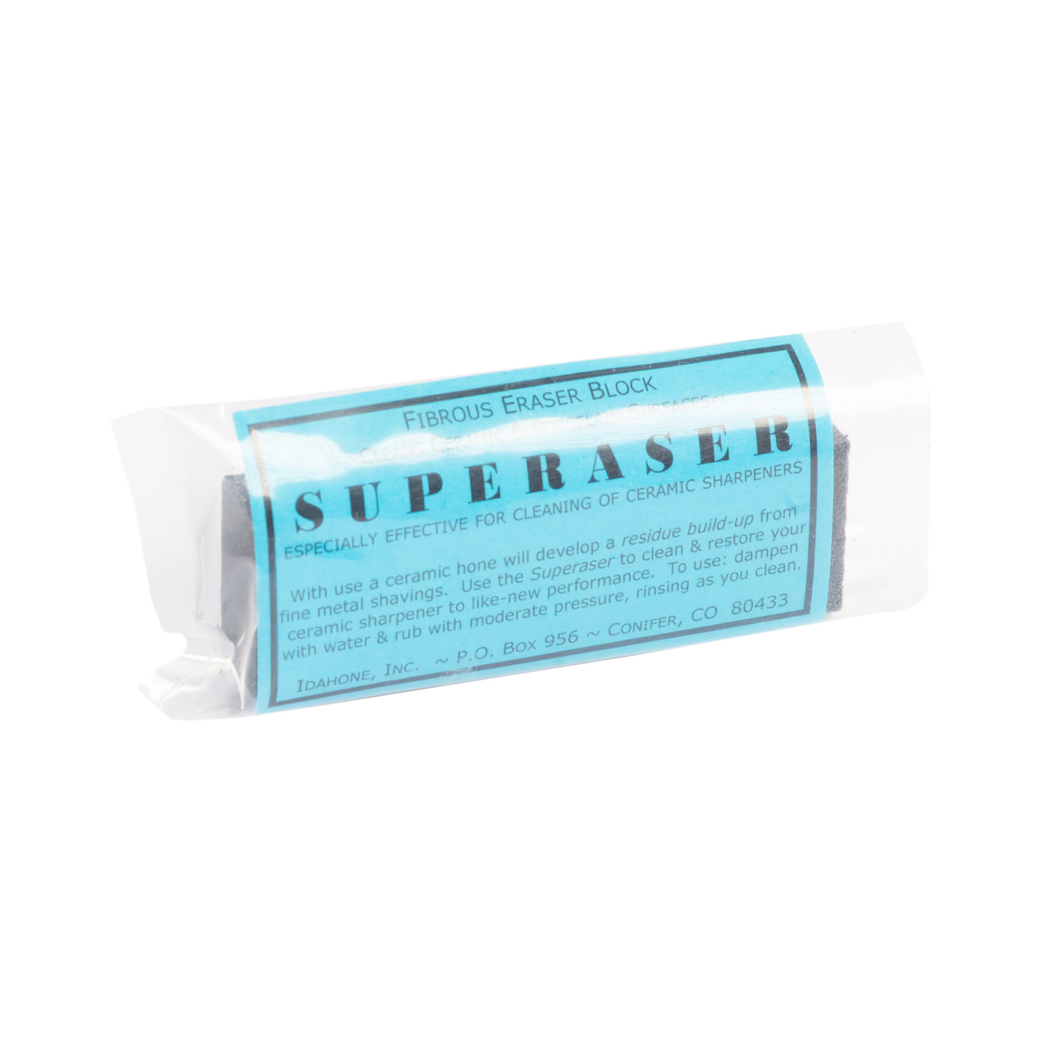 Idahone Eraser is a highly effective product for cleaning ceramic rods and stones made of sintered ceramic, aluminum oxide, and bonded diamonds. With use, a ceramic hone will develop swarf from fine metal shavings. The eraser will clean the surface.
